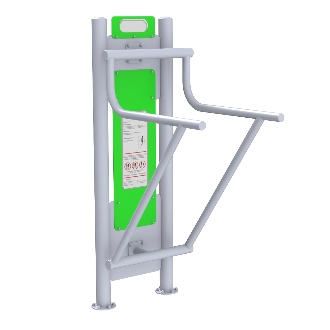 Beschreibung: Zwischen die parallelen Stangen stellen, mit jeder Hand ein Stange halten, jetzt heben Sie den Körper an indem Sie die Ellenbogen stecken, danach die Ellenbogen beugen um wieder mit den Füßen am Boden zu stehen.