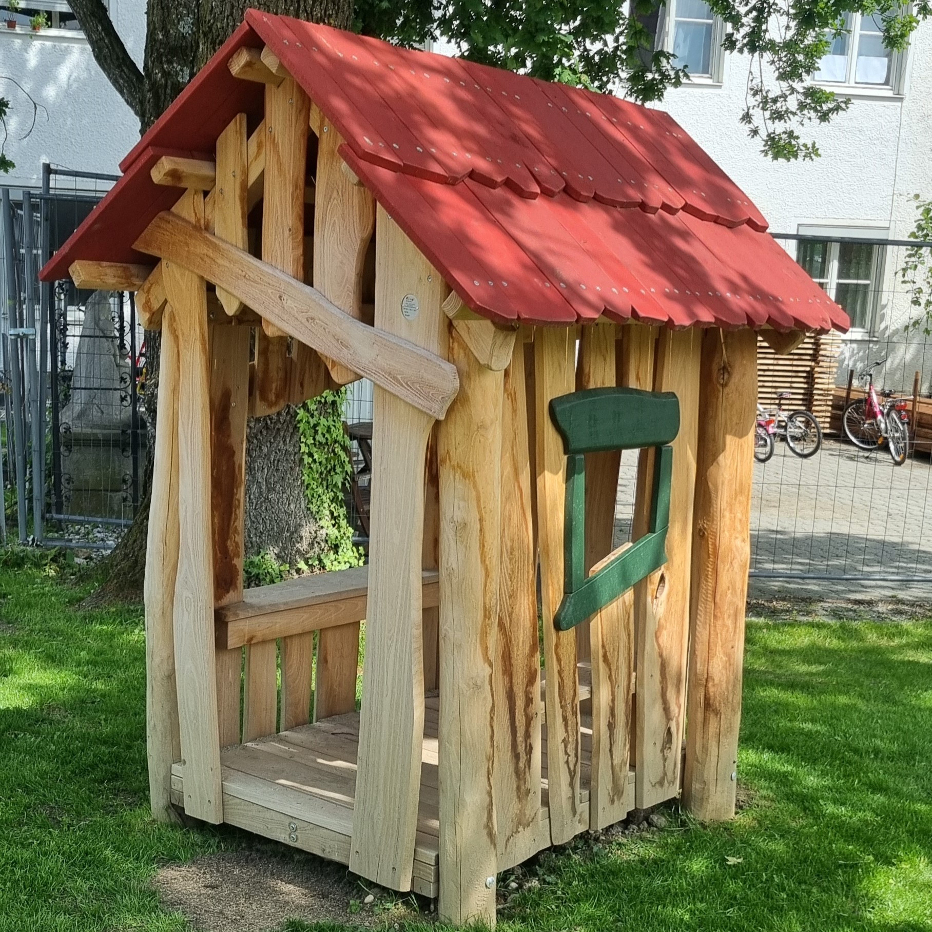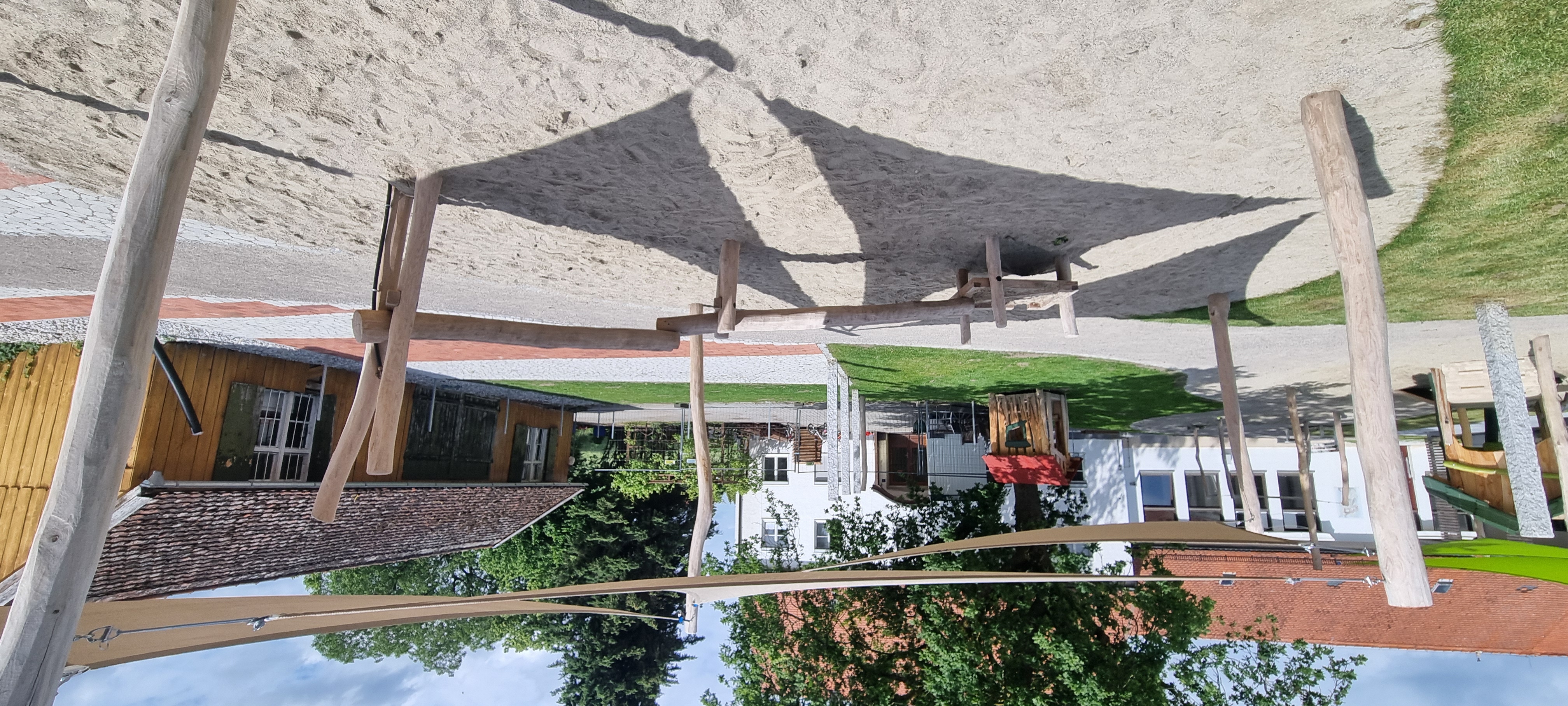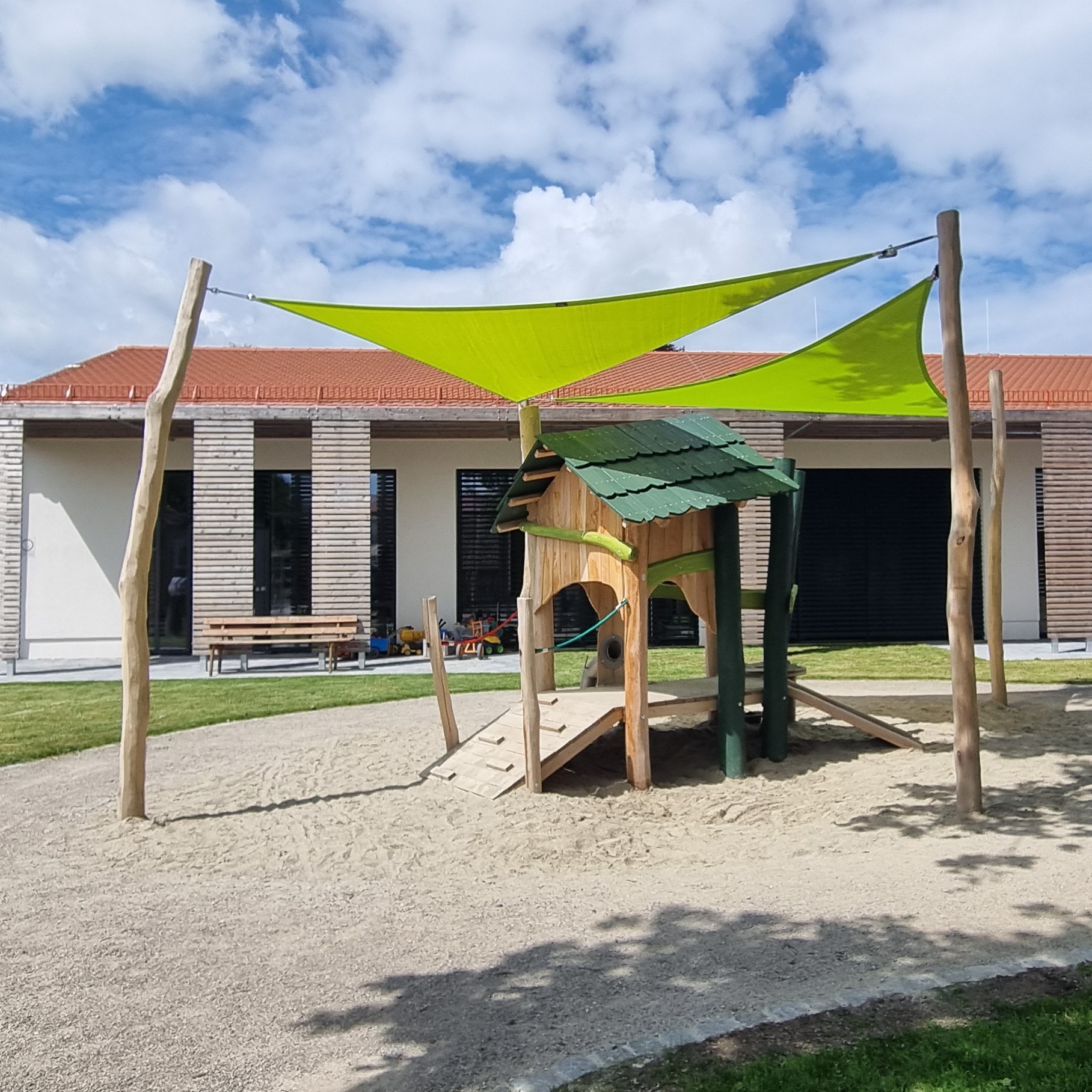 Unser Spielhaus Lukas hat einen schattigen Platz bekommen - für unser Sandspielhaus sowie die Matschanlage durften wir die passende Beschattung mit planen und installieren.