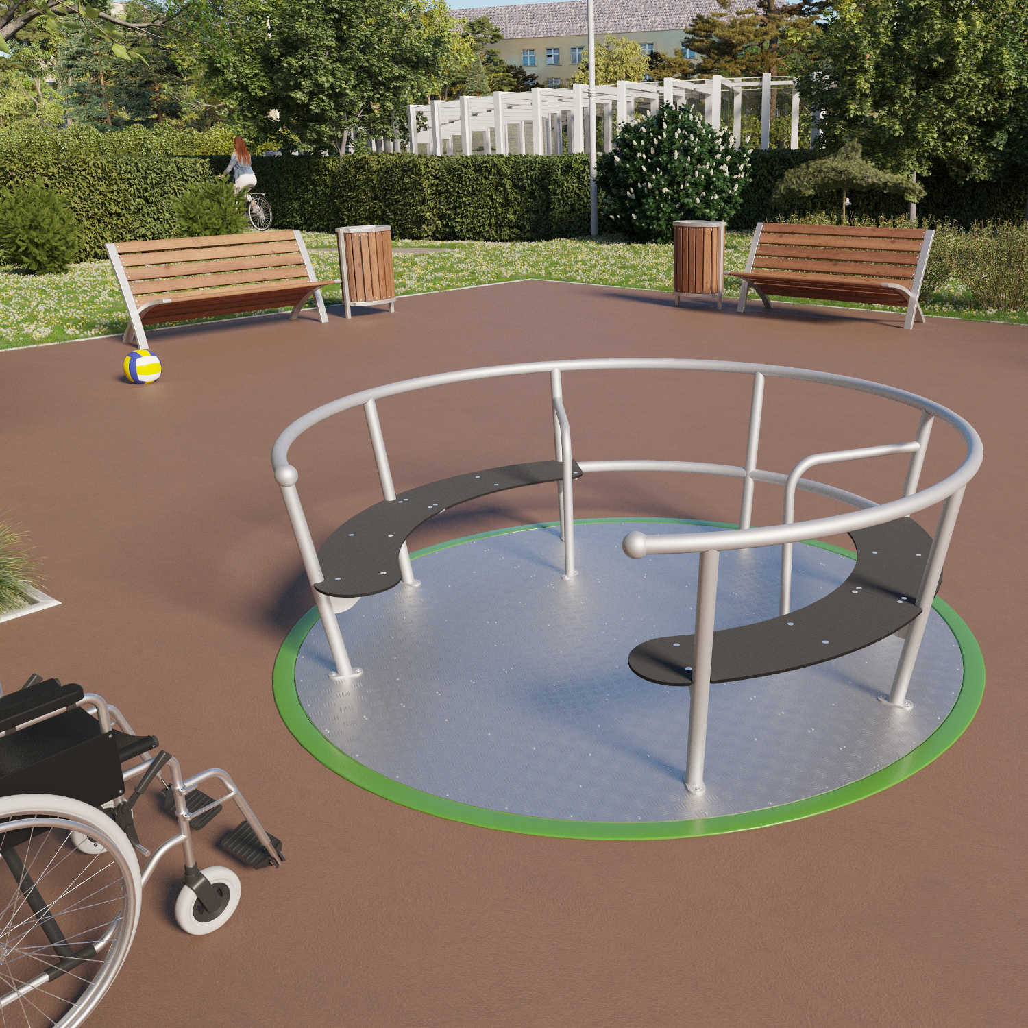 Das Produkt erfordert die Verwendung einer sicheren Oberfläche, die für einen Sturz aus einer Höhe von bis zu 0,6 Metern sowie für erzwungene Bewegungen geeignet ist. Aufgrund der Bestimmung des Karussells für Rollstühle ist es notwendig, eine nicht verschiebende Oberfläche zu verwenden, wie z. B. eine künstliche Oberfläche oder eine andere befestigte Oberfläche. Die Oberfläche muss mit der Eintrittsschwelle des Karussells bündig abschließen.