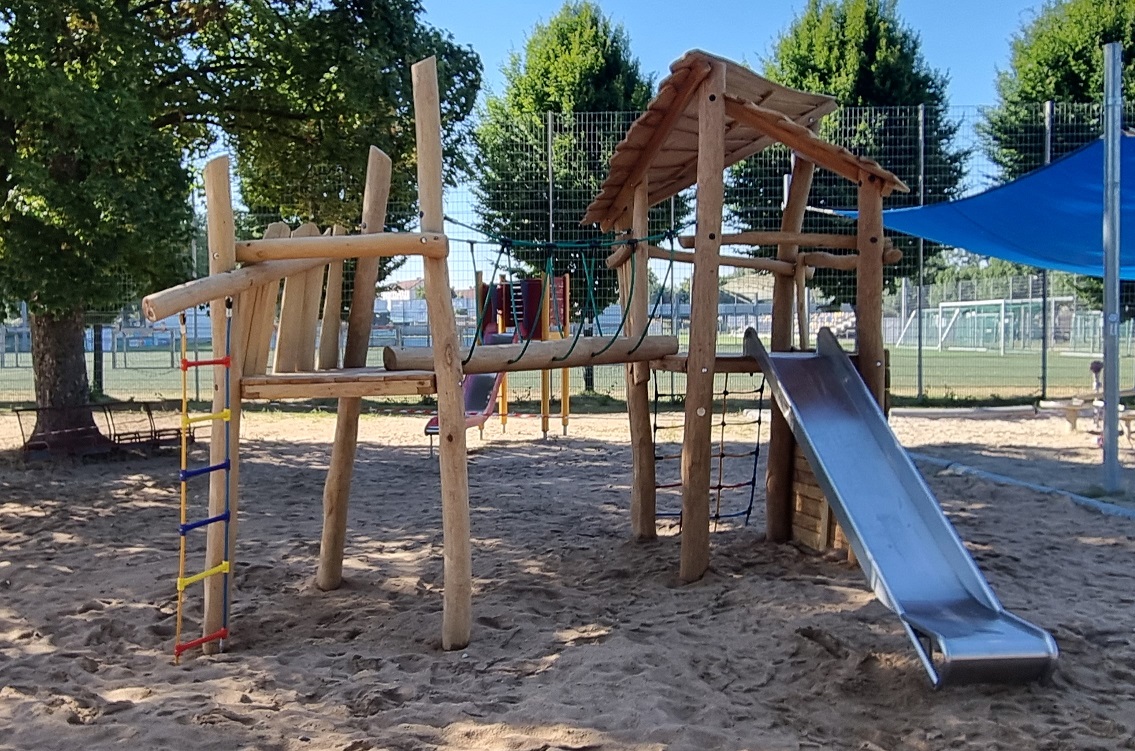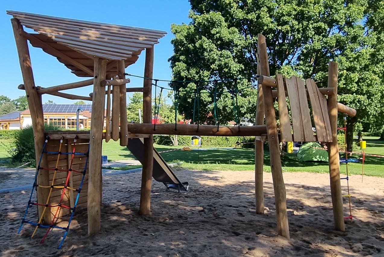 Unsere Spielanlage Afra von Klingl Spielgeräte bietet Kindern vielfältige Möglichkeiten zum Klettern, Rutschen und Balancieren. Gefertigt aus unbehandeltem Robinienholz, überzeugt sie durch ihre natürliche Optik und Langlebigkeit.